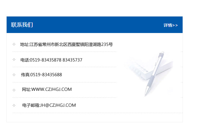 傳真:0519-83435688    郵編:213135    網(wǎng)址:WWW.czjhgj_com.szhshkj.com    電子郵箱:JH@czjhgj_com.szhshkj.com